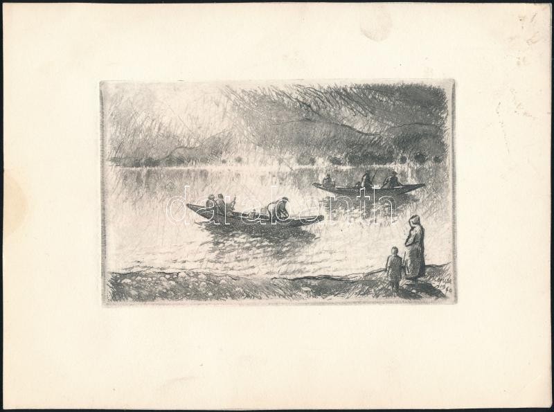 Beschreibung: Kórusz József (1927-2010): Halászok. Rézkarc, papír, jelzés nélkül, 8×14 cm