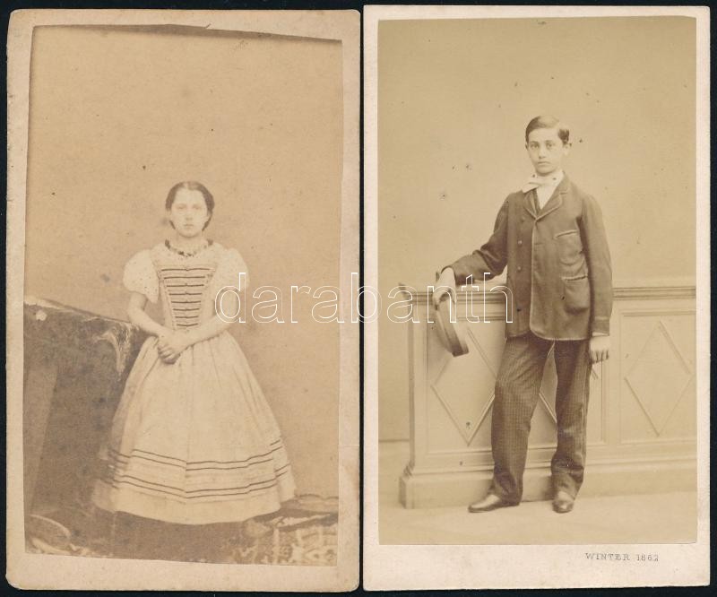 Beschreibung: cca 1868 Vizitkártya méretű műtermi felvételek, 2 db vintage fotó, 10,5x6 cm
