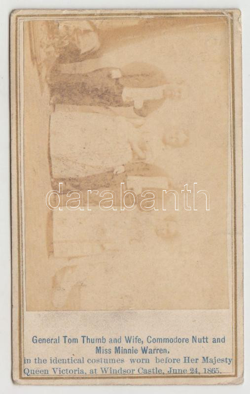cca 1870 General Tom Thumb és Minnie Warren cirkuszművészeket ábrázoló fotó, hátoldalon nyomtatott aláírásaikkal / cca 1870 Original photo of circus artists and dwarfs General Tom Thumb and Minnie Warren 7x11 cm