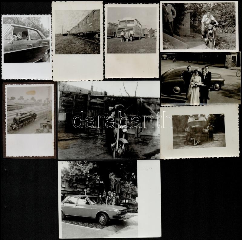 Beschreibung: cca 1930-1980 Közlekedési eszközöket ábrázoló 9 db fotó, köztük mozdony, busz, motor, gépkocsi, 8,5x6,5 és 9x12 cm közti méretben