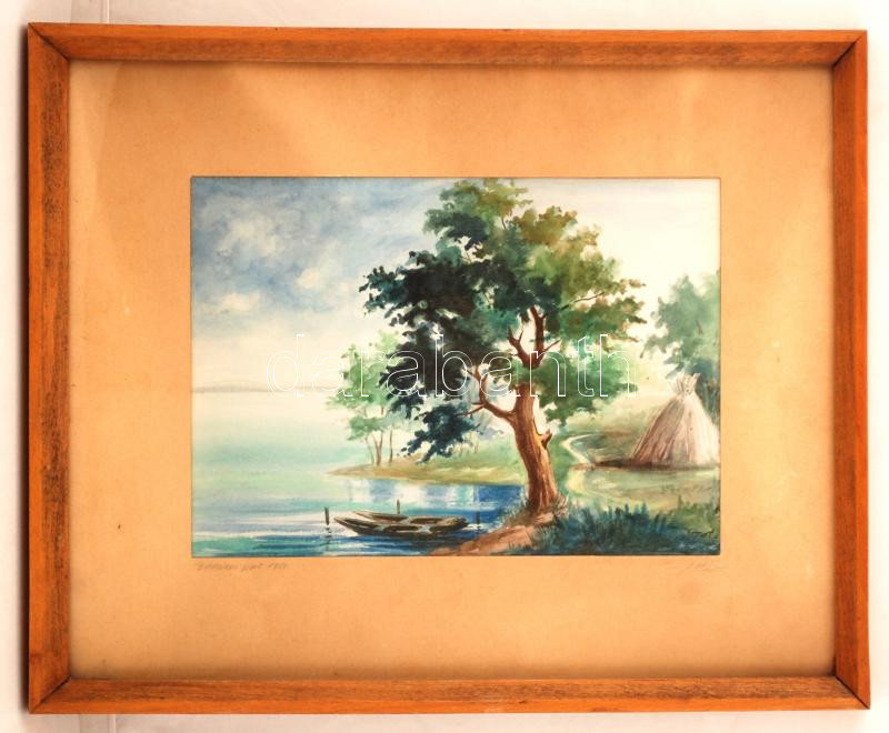 Beschreibung: Gát jelzéssel: Bélatelepi part. Akvarell, papír, üvegezett keretben, 38×48 cm