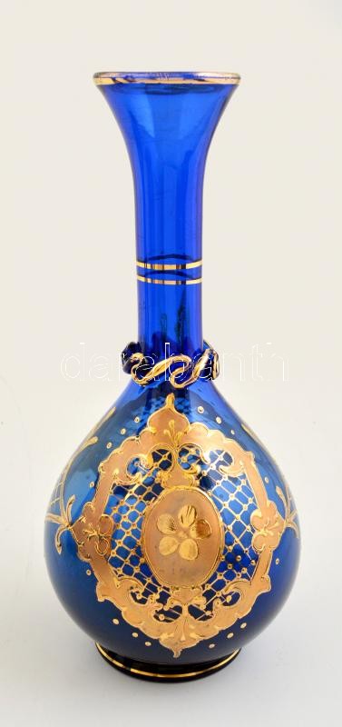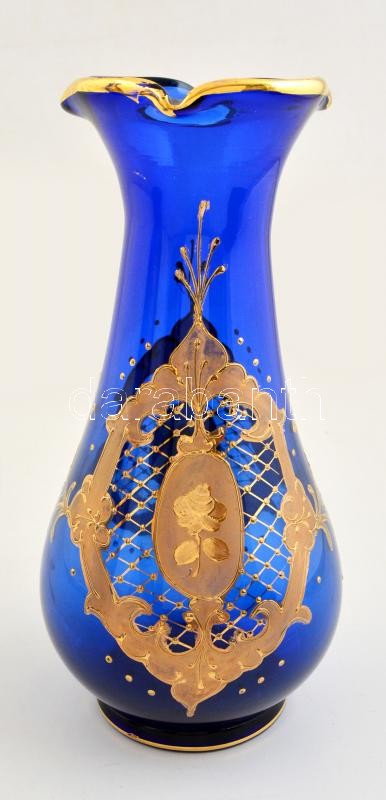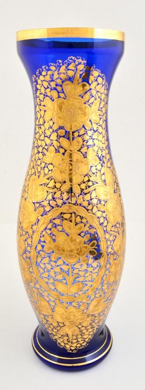 Aranyozott kék üvegtárgyak (vázák, asztali dísztál), jelzés nélkül, kopásnyomokkal, 4 db, m: 21, d: 28 cm, m: 54 cm, 29 cm, 30 cm