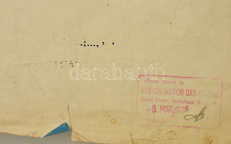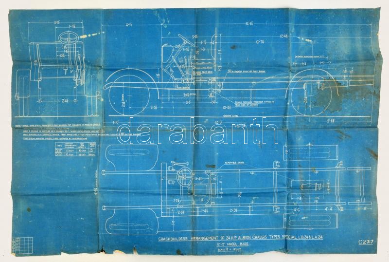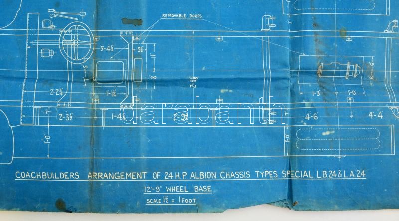 cca 1926 Albion Type 24 szállító furgon tervrajza, cianotípia, a hátoldalán pecséttel, hajtásnyomokkal, foltos, kissé szakadt szélekkel, 65x97 cm cca 1926 Plan of Albion Type 24 delivery van,cyanotype, with seal on the back, spotty, little bit raunchy, 65x97 cm.