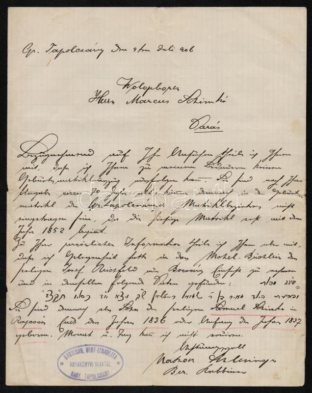 cca 1910 Nagytapolcsányi rabbi által aláírt igazolás https://www.darabanth.com/de/319-Fernauktion/319.0/Andere-Sammelgebiete/Judaica~24/cca-1910-Nagytapolcsanyi-rabbi-altal-alairt-igazolas~II1762189