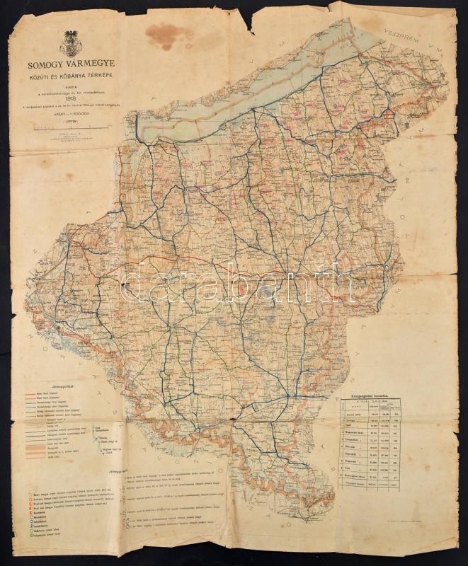 1918 Somogy vármegye közúti és kőbánya térképe, 1:200.000, Bp., Klösz György és fia Térképészeti Műintézete, megviselt állapotban, sérült, szakadt, gyűrött, foltos, 74x60 cm