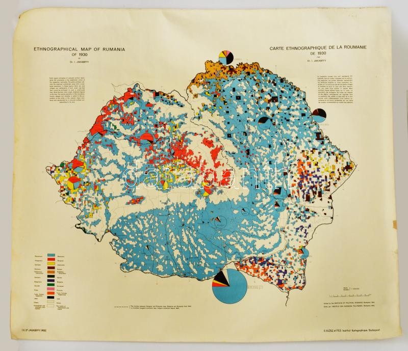 1942 Ethnographical Map of Rumania of 1930 / Carte ethnographique de la Roumaine de 1930, Románia néprajzi térképe az 1930-as állapotok szerint, 1:1000000, terv. Jakabffy Imre, Bp., Politikatudományi Intézet, 85×98 cm