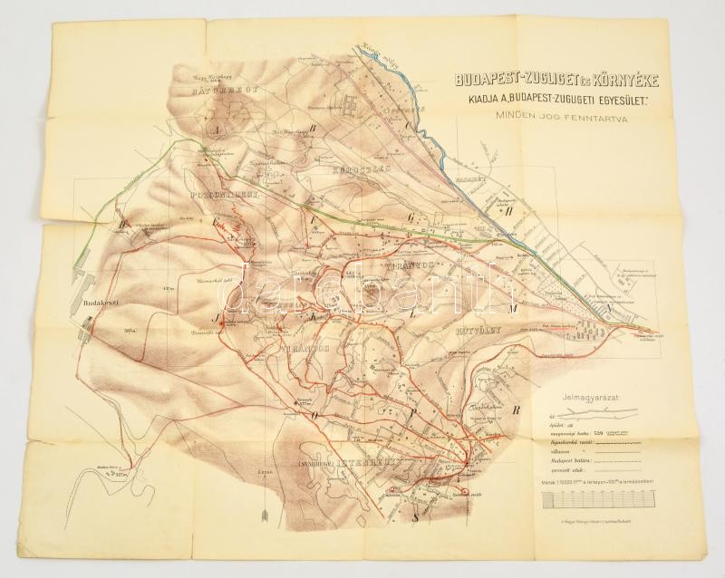 Beschreibung: Budapest-Zugliget és környéke, lépték nélkül, Kiad. Budapest-Zugligeti egyesület, a hajtások mentén sérülésekkel, 66×55,5 cm