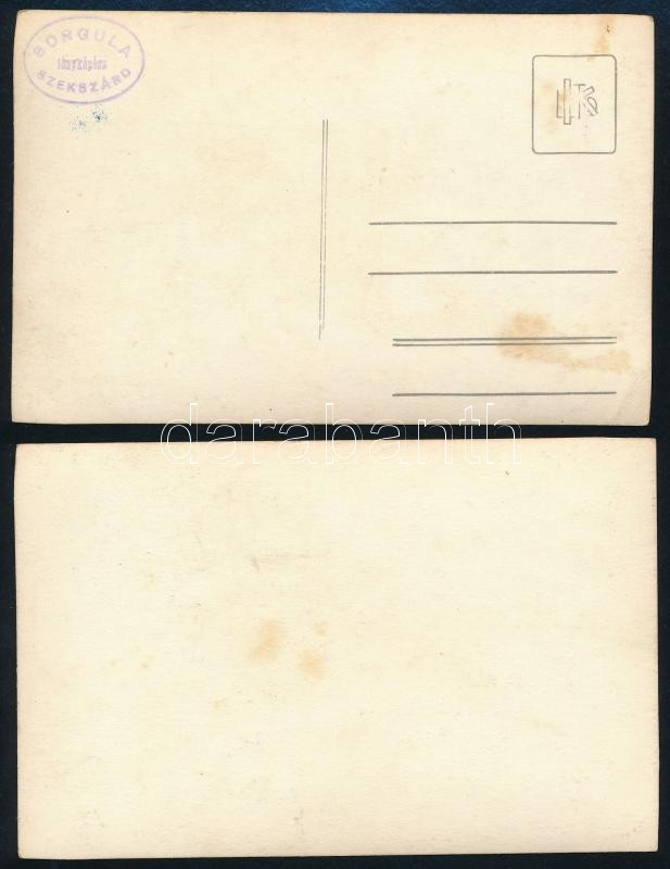 Beschreibung: cca 1920-1930 Katonák kísérettel, 2 db fotó Borgula szekszárdi műterméből, az egyik hátulján pecséttel jelzett, 9×14 cm
