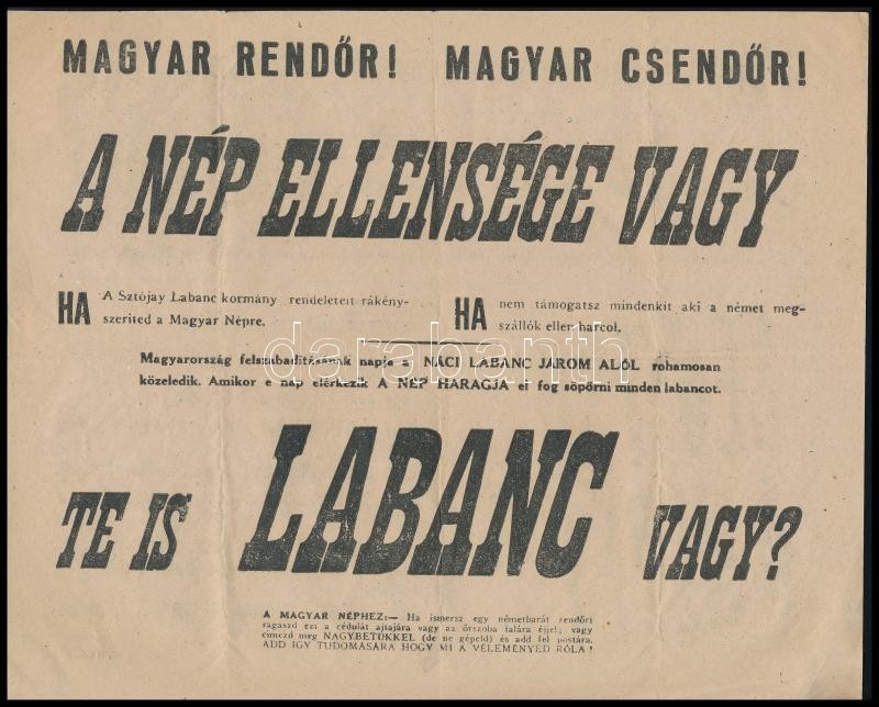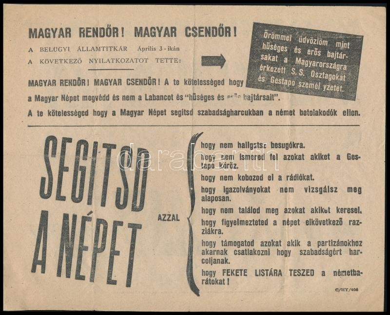 Beschreibung: cca 1944 Magyar rendőrökhöz és csendőrökhöz szóló, a német SS-szel való szembeállásra felszólító kétoldalas szórólap, 21x25 cm