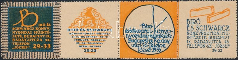 Beschreibung: 1910 Bíró és Schwarz Könyvnyomdai Műintézet 4 klf levélzáró négyescsíkban