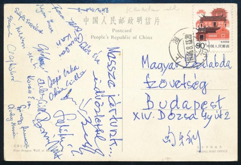 Beschreibung: A női kézilabda válogatott tagjainak aláírásai Kínából küldött levelezőlapon