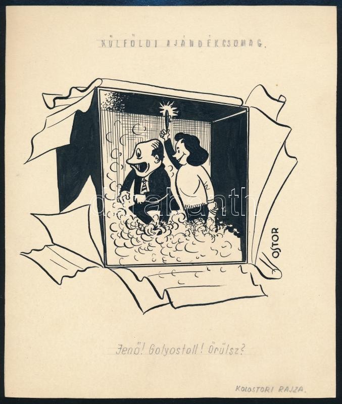 Beschreibung: cca 1960-1970 Kolostori Mária: "Külföldi ajándékcsomag" - golyóstollat reklámozó tusrajz, 19,5×16,5 cm