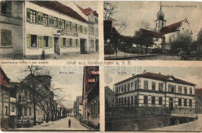 Grosssachsen a. d. B., Kirche, Kriegerdenkmal, Schule, Breitgasse, Gasthaus zum Löwen von Jak. Alberth / church, war monument, school, street, guest house (EK)