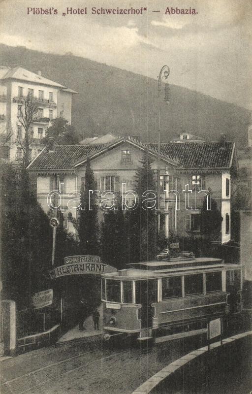 Abbazia, Opatija; Plöbst's Hotel Schweizerhof / hotel and restaur... https://www.darabanth.com/de/319-Fernauktion/319.0/Ansichtskarten/Kroatien~2500009/Abbazia-Opatija-Plobsts-Hotel-Schweizerhof-hotel-and-restaurant-with-tram-Josip-Skrablin-foto~II1764090