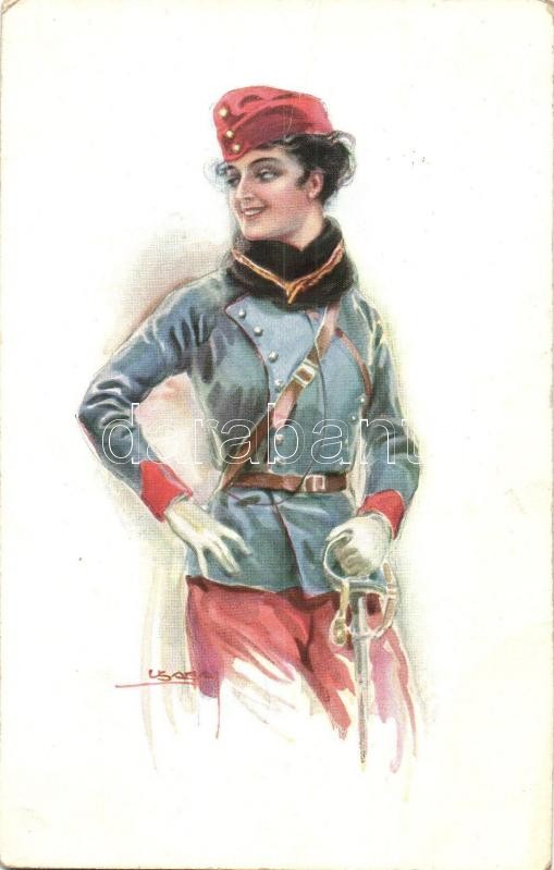 Beschreibung: Lady soldier with sword. Italian art postcard. ERKAL No. 331/b. s: Usabal (EK)