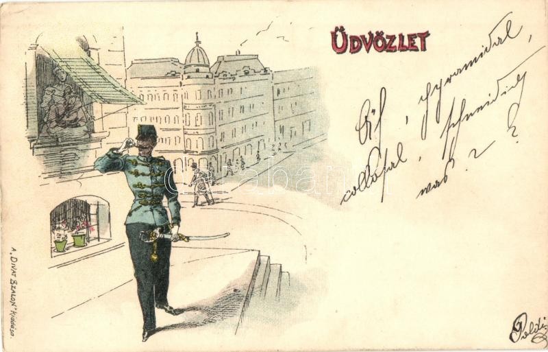 Beschreibung: 1899 Magyar honvéd huszárok; Üdvözlet, a Divat Szalon kiadása / Hungarian soldiers 'Grüss aus...' litho