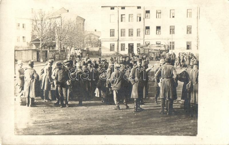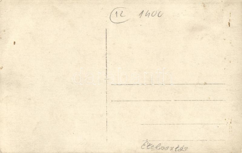 Első világháborús osztrák-magyar katonai lap, ételosztás háttérben letakart cséplőgéppel / WWI K.u.k. military, food distribution with threshing machine in the background, photo