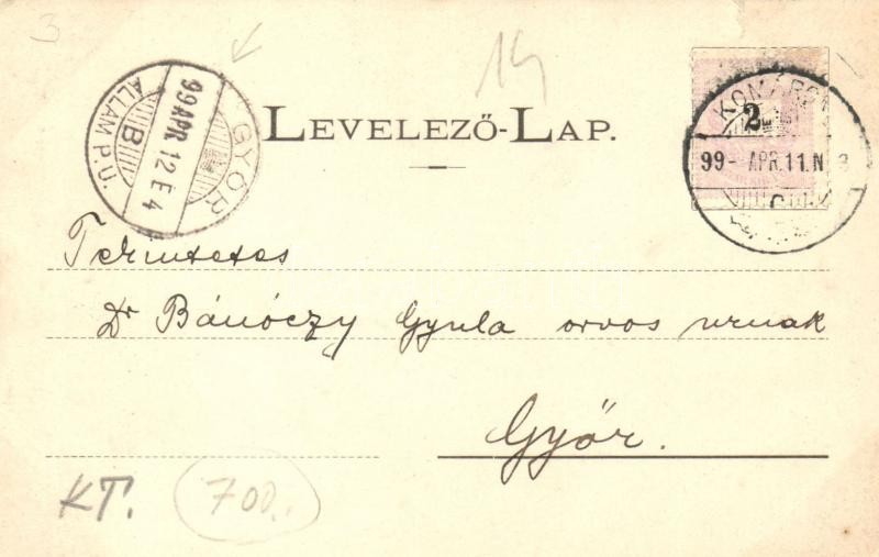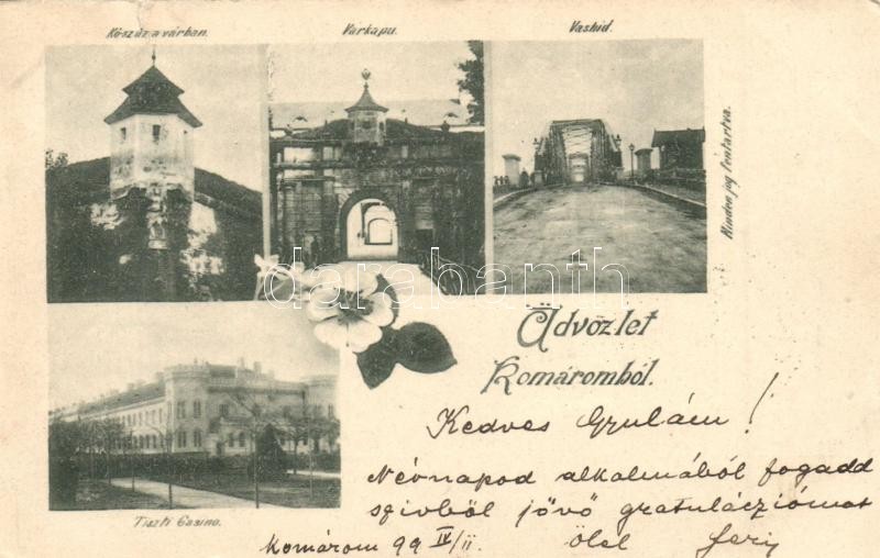 1899 Komárom, Komárno; Kőszűz a várban, Várkapu, Vashíd, Tiszti Kaszinó / statue, bastion tower, castle, castle gate, bridge, casino. floral Art Nouveau (kis szakadás / small tear)