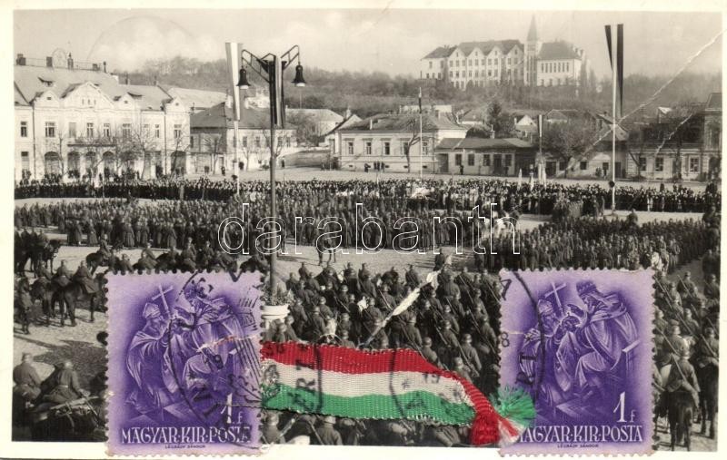 1938 Léva, Levice; bevonulás, Tábori mise a Kossuth téren, rajta magyar zászló, szalag / entry of the Hungarian troops, Hungarian flag, ribbon + Léva visszatért So. Stpl. (fa)