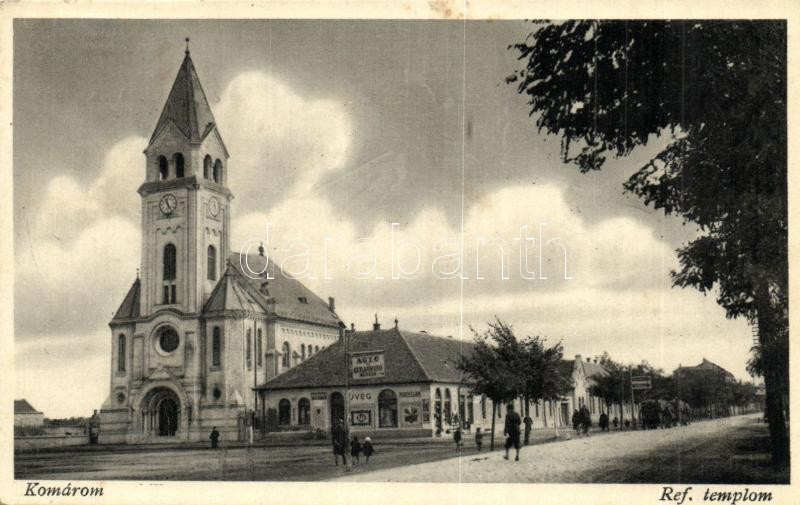 Beschreibung: Komárom, Komárno; Református templom, autó és gépjavító műhely. Hacker Dezső kiadása / Calvinist church with auto repair workshop