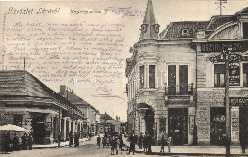 Léva, Levice; Kazinczy utca, Osztrák-Magyar Bank mellékhelye, Biztosító Intézet, Borcsányi és Csernák, Holzmann Bódog, Pall és Noób üzletei / street, insurance company, bank, shops (EK)