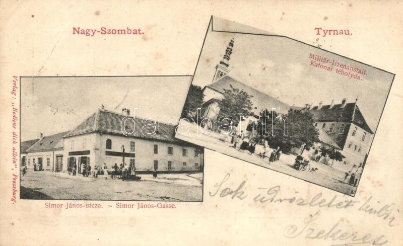 Nagyszombat, Tyrnau, Trnava; Simor János utca, üzlet, Katonai tébolyda (elmegyógyintézet) / Militär-Irrenanstalt, Simor János-Gasse. Verlag "Bediene dich allein" / street view, shop, military bedlam, mental asylum