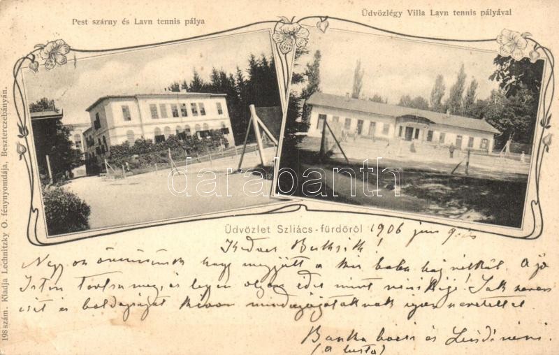 Szliács, Sliac; Pest szárny és Lawn teniszpálya, Üdvözlégy Villa és teniszpálya. Kiadja Lechnitzky O. 198. sz. / villa, tennis court, tennis players. Art Nouveau, floral (EK)