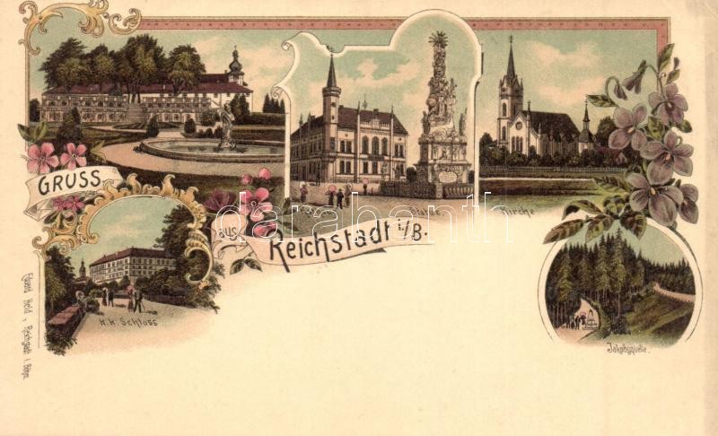 Zákupy, Reichstadt; K. K. Schloss, Rathaus, Statue, Kirche, Jakobsquelle. Eduard Held / Castle, Town hall, Trinity statue, Church, thermal spring. Art Nouveau, floral, litho (EK)
