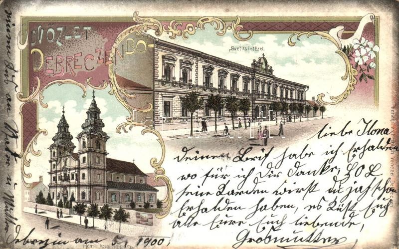 1900 Debrecen, Római katolikus templom, Svetits intézet. Fröhlich Venc... https://www.darabanth.com/de/319-Fernauktion/319.0/Ansichtskarten/Ungarn~2500005/1900-Debrecen-Romai-katolikus-templom-Svetits-intezet-Frohlich-Vencel-Art-Nouveau-floral-lit~II1764123