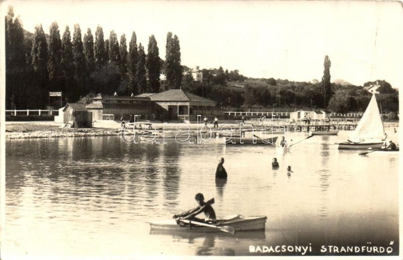 1932 Badacsony, Strandfürdő, fürdőzők, evezősök, vitorlás. Domoniczky ... https://www.darabanth.com/de/319-Fernauktion/319.0/Ansichtskarten/Ungarn~2500005/1932-Badacsony-Strandfurdo-furdozok-evezosok-vitorlas-Domoniczky-S-photo-fa~II1761815