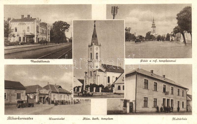 Beschreibung: Biharkeresztes, vasútállomás, utcakép automobillal, Római katolikus és református templom, kultúrház, Fő tér