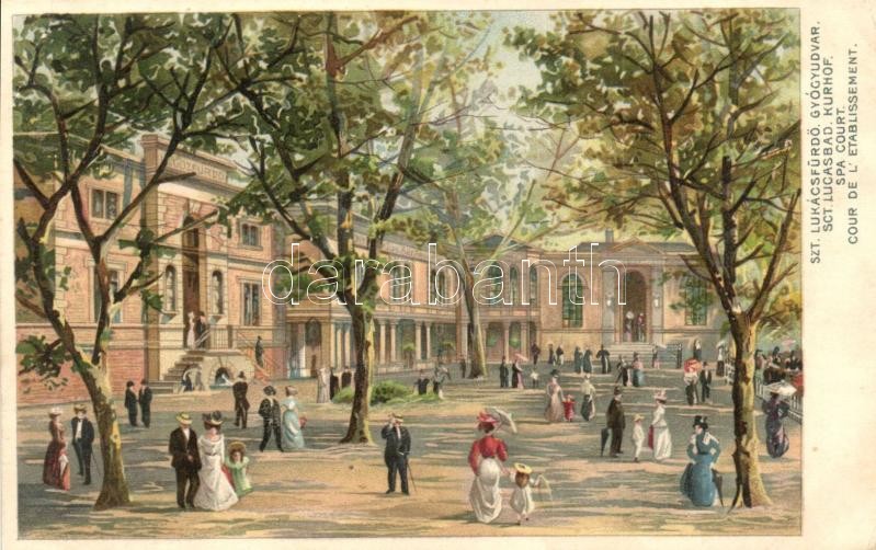 Budapest II. Szent Lukács fürdő, Gyógyudvar. Art Nouveau litho (EK) https://www.darabanth.com/de/319-Fernauktion/319.0/Ansichtskarten/Ungarn~2500005/Budapest-II-Szent-Lukacs-furdo-Gyogyudvar-Art-Nouveau-litho-EK~II1762352