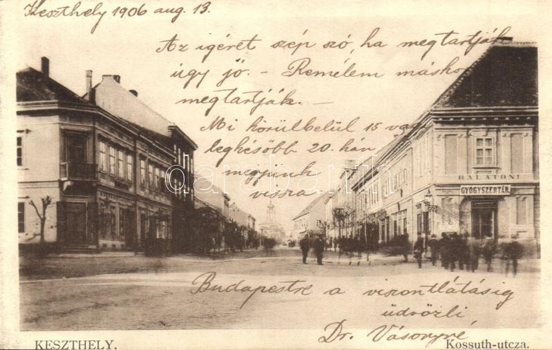 Keszthely, Kossuth utca, Balatoni gyógyszertár. Mérei Kiadása 4. sz. https://www.darabanth.com/de/319-Fernauktion/319.0/Ansichtskarten/Ungarn~2500005/Keszthely-Kossuth-utca-Balatoni-gyogyszertar-Merei-Kiadasa-4-sz~II1762294