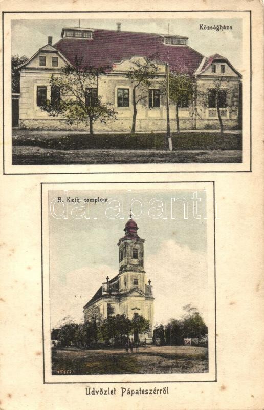 Beschreibung: Pápateszér, Római katolikus templom, Községháza. Katz Gyula kiadása (fl)
