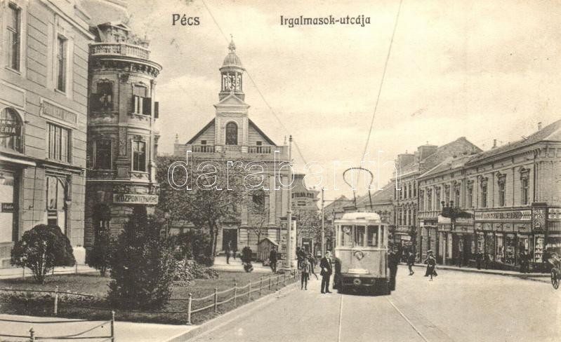 Beschreibung: Pécs, Irgalmasok utcája, Központi kávéház, Dr. Tolnai Jenő, Lang H. Fia üzlete, drogéria (gyógyszertár), villamos. Fürst Lipót kiadása (Rb)
