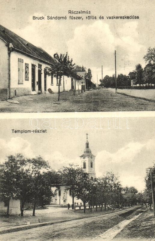 Beschreibung: Rácalmás, Templom részlet utcával, Bruck Sándorné fűszer, rőfös és vaskereskedése