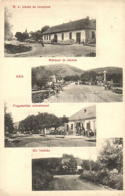 Beschreibung: Rád, Római katolikus iskola és templom, Rákóczi út, Fogyasztási Szövetkezet üzlete, Evangélikus imaház. Kiadja a rádi fogyasztási szövetkezet (EK)
