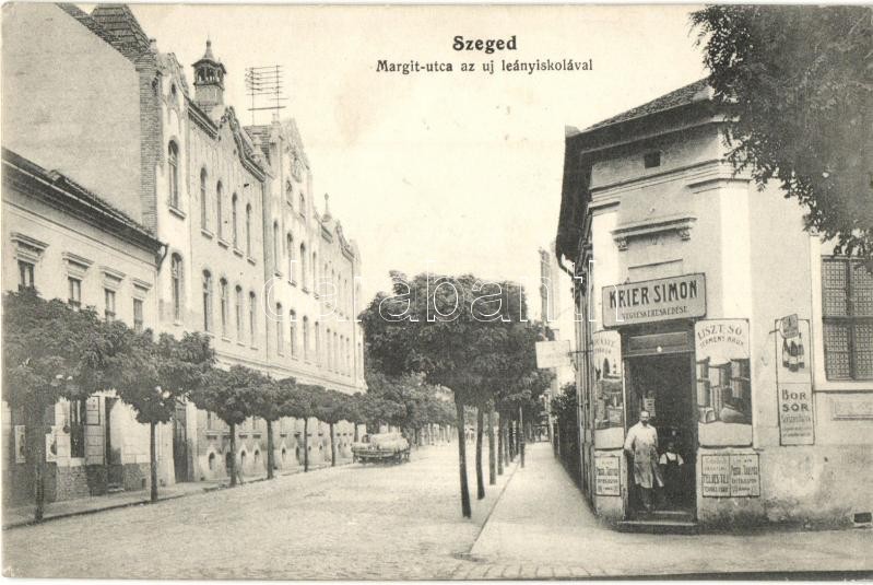 Szeged, Margit utca az új leányiskolával, Krier Simon üzlete (EK) https://www.darabanth.com/de/319-Fernauktion/319.0/Ansichtskarten/Ungarn~2500005/Szeged-Margit-utca-az-uj-leanyiskolaval-Krier-Simon-uzlete-EK~II1616547