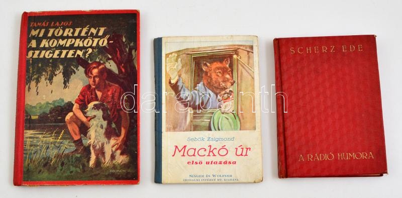 3 db regény: Sebők Zsigmond: Maczkó úr első utazása (Bp., 1915); Scherz Ede: A rádió humora (Bp., 1931); Tamás Lajos: Mi történt a kompkötő szigeten? (Bp., é. n.). Példányonként változó, nagyrészt jó állapotban.