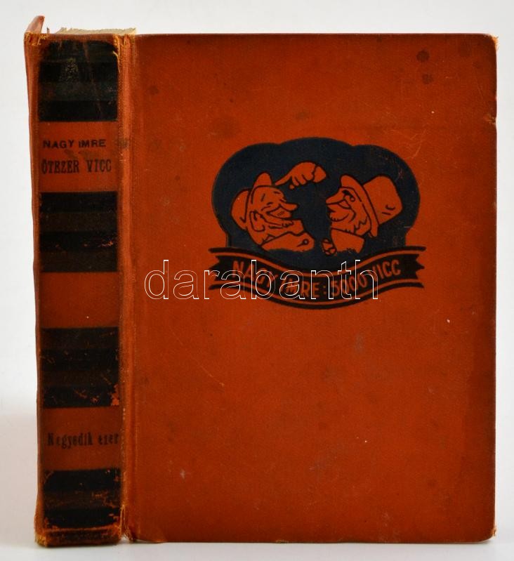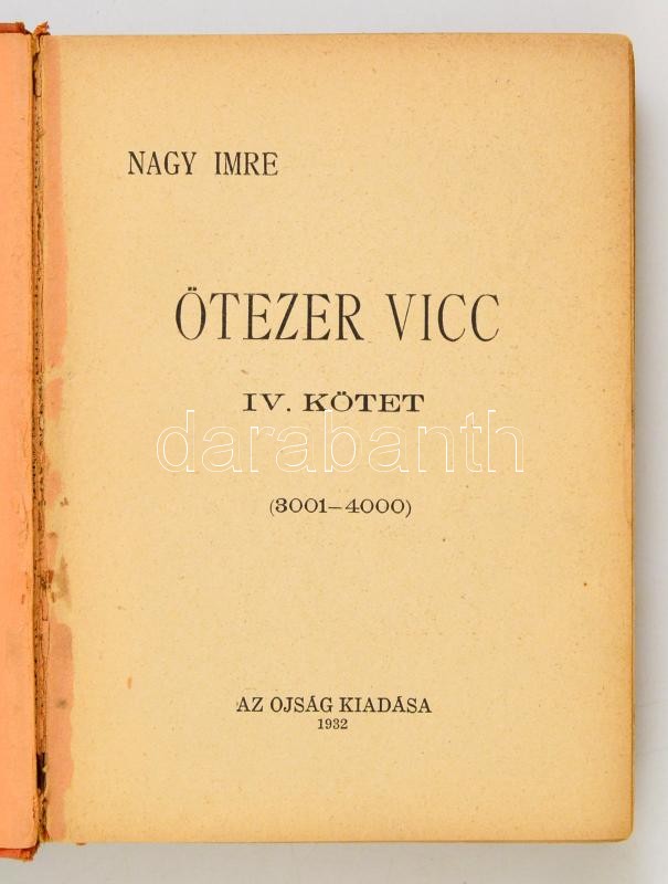 Nagy Imre: Ötezer vicc. IV. kötet. (3001-4000) Bp.,1932, Ojság, 240 p. (Zsidóviccek gyűjteménye). Kiadói egészvászon-kötés, kopott borítóval, kissé sérült gerinccel.