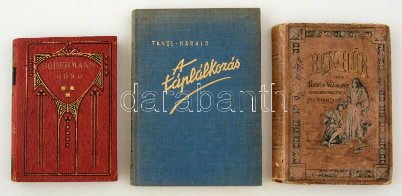 Vegyes könyvtétel, 3 db: Sudermann Hermann: Gond. Fordította Balla Mihály. Bp., 1927, Nova. Kiadói aranyozott egészvászon, kissé kopottas gerinccel. Lewis Wallace: Ben-Húr I. Regény Kriszturól. Fordította Szekrényi Lajos. Szeged, 1894, Fordító kiadása. Kiadói illusztrált egészvászon kötés, rossz állapotban. Tangl Harald: A táplálkozás. Bp., é.n., Királyi Magyar Természettudományi Társulat. Királyi Magyar Egyetemi Nyomda. Kiadói egészvászon kötésben.