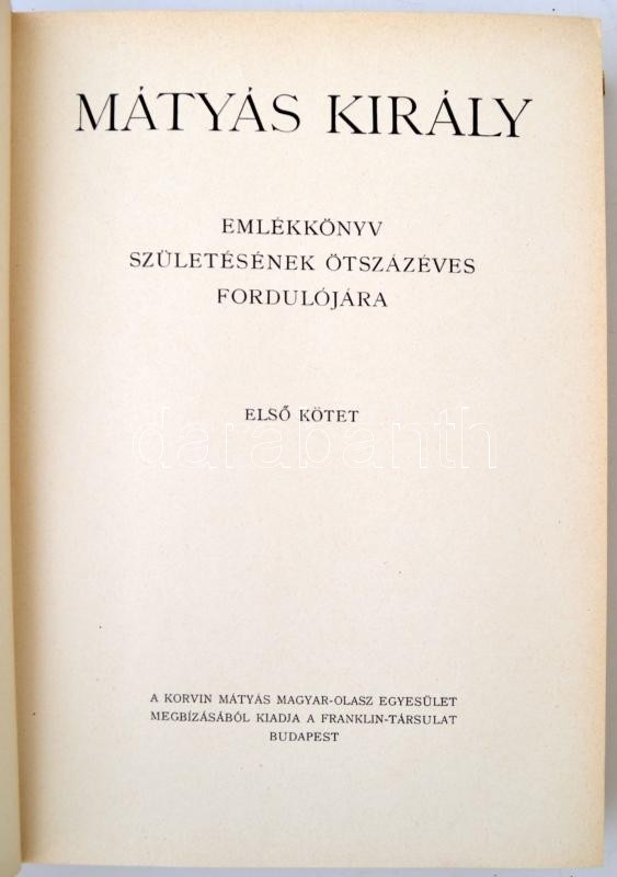 Mátyás király. Emlékkönyv születésének ötszázéves évfordulójára. Szerk.: Lukinich Imre. I. köt. Bp., 1943, Franklin. Gerincén sérült, felhasadt kiadói félbőrkötésben, belül kiváló állapotban.