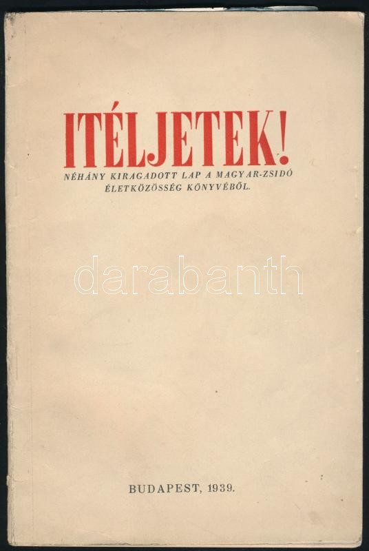 Ítéljetek! Néhány kiragadott lap a magyar-zsidó életközösség könyvéből. Szerk.: Vida Márton. Bp., 1939,(Lőbl D. és Fia-ny.), 62+2 p.+1 sztl. lev. Kiadói papírkötés.