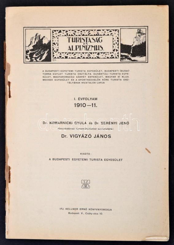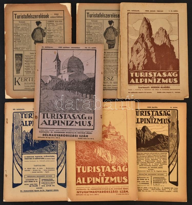 1911-1924 Turistaság és alpinizmus 7 száma. Szerk.: Dr. Vigyázó János, Dr. Komarnicki Gyula, Hensch Aladár. I. évf. XII. füzet., II. évf. IV. füzet: Tátra szám, VII. évf. 6. sz., X. évf. 4. sz., XI. évf. 4., 10-11 sz., XIV. évf. 1-2. sz. Kiadói papírkötés, változó, többnyire szakadozott állapotban.