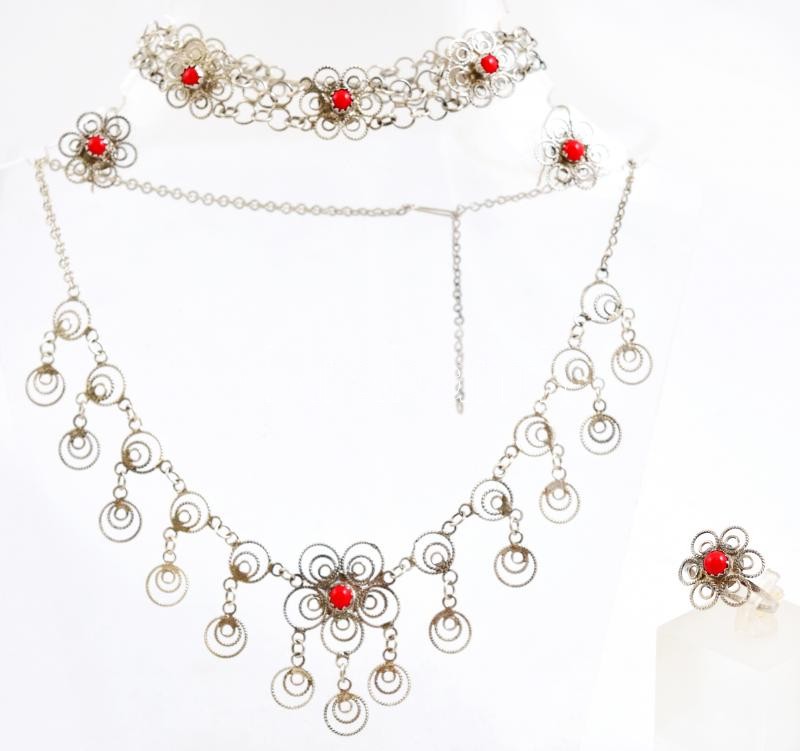 Ezüst(Ag) ékszer szett korral díszítéssel (fülbevaló, gyűrű, nyaklánc,... https://www.darabanth.com/de/319-Fernauktion/319.0/Juwelen/Juwelen~1/EzustAg-ekszer-szett-korral-diszitessel-fulbevalo-gyuru-nyaklanc-karkoto-jelzett~II1762203