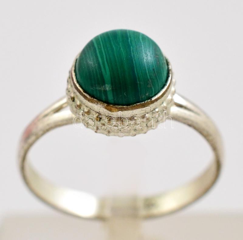 Ezüst(Ag) gyűrű malachit kővel, jelzett, méret: 53, bruttó: 2 g https://www.darabanth.com/de/319-Fernauktion/319.0/Juwelen/Juwelen~1/EzustAg-gyuru-malachit-kovel-jelzett-meret-53-brutto-2-g~II1762190