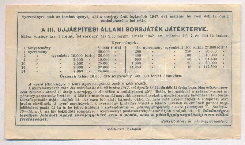 1947. "Egész-Sorsjegy a III. Újjáépítési Állami Sorsjátékra"... https://www.darabanth.com/de/319-Fernauktion/319.0/Numismatik/Aktien-und-Tickets~2000005/1947-Egesz-Sorsjegy-a-III-Ujjaepitesi-Allami-Sorsjatekra-sorsjegy-TIII~II1759120