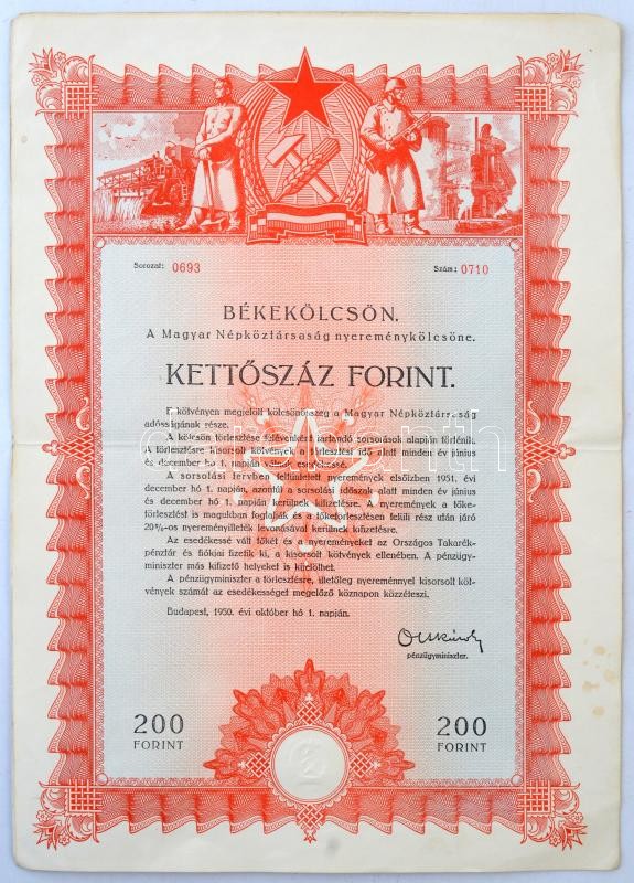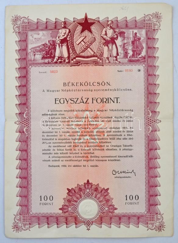 1950. "Békekölcsön" nyereménykölcsön 100Ft-ról szárazpecsétt... https://www.darabanth.com/de/319-Fernauktion/319.0/Numismatik/Aktien-und-Tickets~2000005/1950-Bekekolcson-nyeremenykolcson-100Ft-rol-szarazpecsettel-plus-Bekekolcson-nyeremen~II1764213