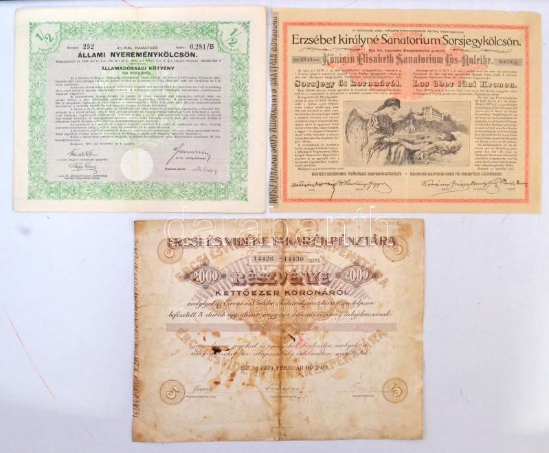 Beschreibung: Budapest 1904. "Erzsébet királyné Sanatorium Sorsjegykölcsön" 5K értékben, szárazpecséttel + 1941. "4%-kal kamatozó Állami Nyereménykölcsön" államadóssági kötvénye + Ercsi 1924. "Ercsi és Vidéke Takarékpénztára" részvény 2000K-ról, szárazpecséttel T:III,III-