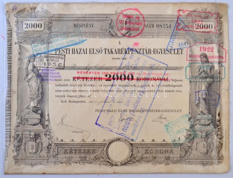 Budapest 1911. "Pesti Hazai Első Takarékpénztár-Egyesület" névre szóló részvénye 2000K-ról, szárazpecséttel, számos bélyegzéssel, vízjeles papíron T:III,III-